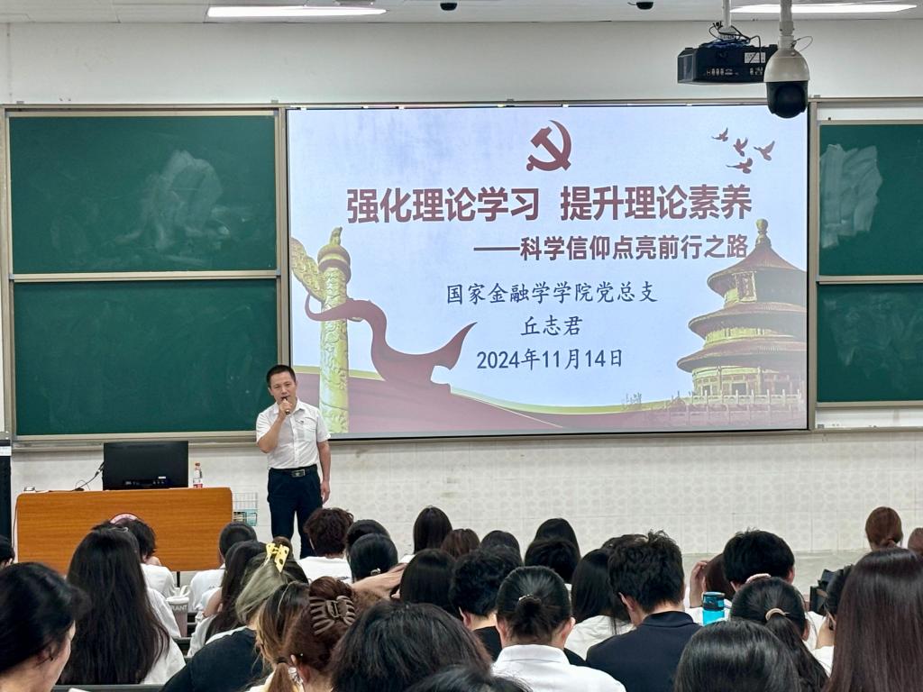 党课上,丘志君书记以《强化理论学习  提升理论素养——科学信仰点亮前行之路》为题作了专题讲授。他指出,马克思主义既是科学的理论体系,又是一种坚定的信仰,两者的关系是辩证统一的,同学们要树立正确的马克思主义观,坚持理论联系实际和坚持终身学习,始终以正确的学风来保证完整准确地理解信仰马克思主义坚决反对主观主义和教条主义。接着,他从重大理论创新成果产生背景、统一严整的科学理论体系、“两个结合”规律性认识、世界观和方法论的高度等方面阐述,希望与会入党积极分子深刻理解和科学把握新时代党的创新理论,切实增强思想认同和理论自信。最后,他希望同学们坚持以习近平新时代中国特色社会主义思想为指导,做到“真学、真懂、真信、真用”,将理论学习作为终身“必修课”,主动将新时代党的创新理论内化为内在的价值规范,朝着全面和健康的方向发展,重视理想信念教育,锤炼政治品格,提升理论素养,明大德、守公德、严私德,“扣好人生第一颗扣子”,重视“精神之钙”的作用,努力朝着成为“德智体美劳全面发展、堪当民族复兴大任”的时代新人发展。