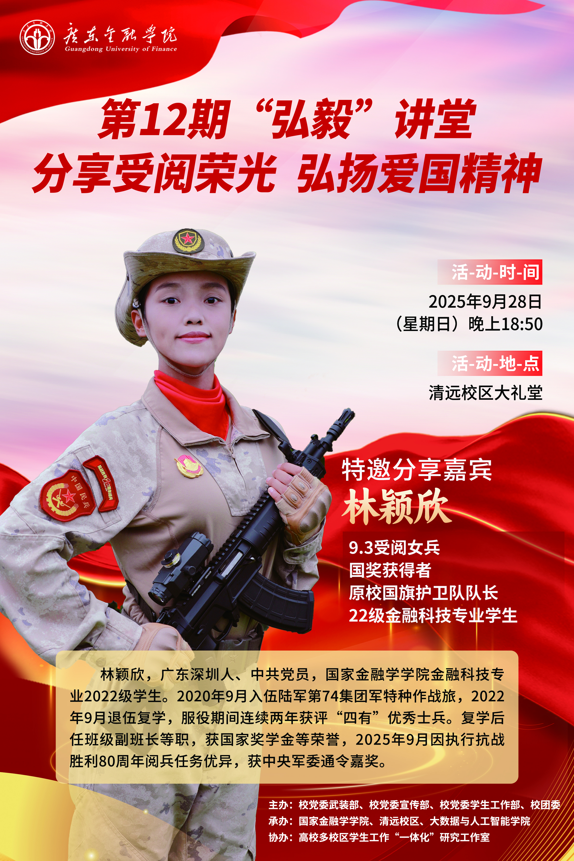 9月28日,在第12期“弘毅”讲堂上,林颖欣为清远校区七百余名师生带来“分享受阅荣光 弘扬爱国精神”专题报告。本次活动由公司党委武装部、公司党委宣传部、公司党委员工工作部、校团委等部门主办,db真人体育官网、清远校区承办,高校多校区员工工作“一体化”研究工作室协办。清远市教育局党组成员、副局长伏开放博士,清远校区党工委常务副书记兼大数据与人工智能公司党总支书记何飞,国家金融学公司党总支书记丘志君及辅导员代表黄雪梅、彭妍年、孔智仪、曾昭文、李影媚等出席活动。活动由清远校区党工委副书记兼大数据与人工智能公司党总支副书记缪洁主持。