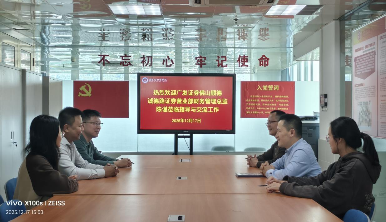 12月17日,公司员工、广发证券佛山顺德诚德路证券营业部财务管理总监陈谨到访db真人体育官网,围绕深化校企合作、推动人才培养等议题与公司展开深入探讨。公司党总支书记丘志君、副书记张栋贤、辅导员及教学秘书等共同参与此次交流活动。