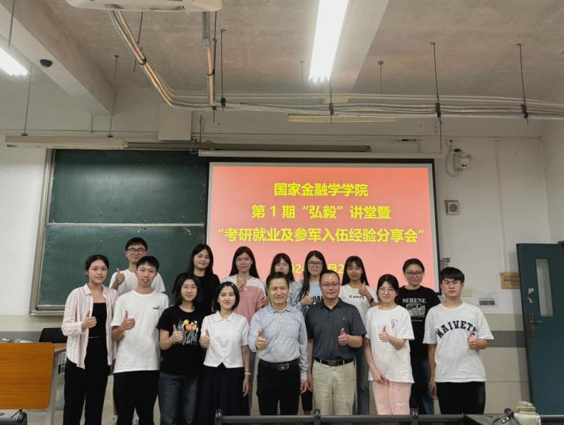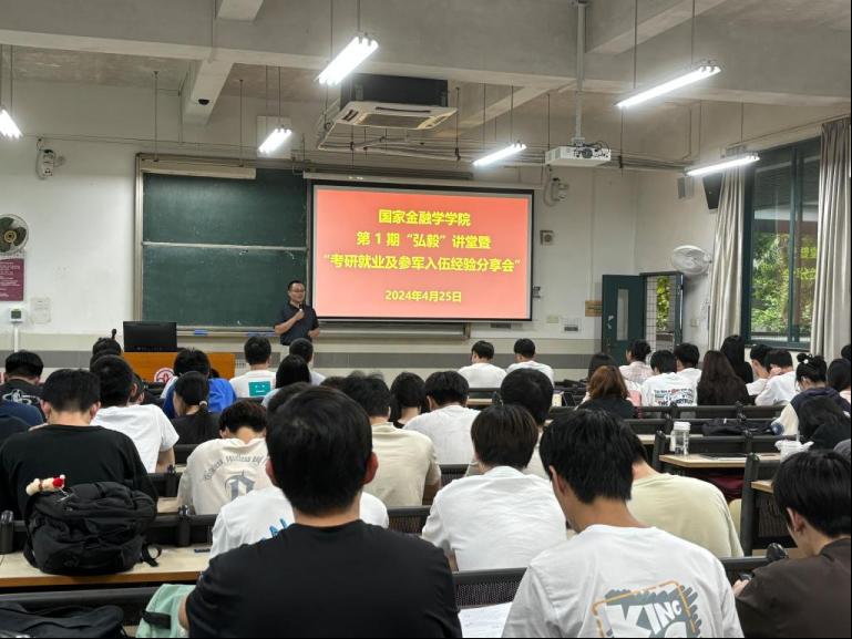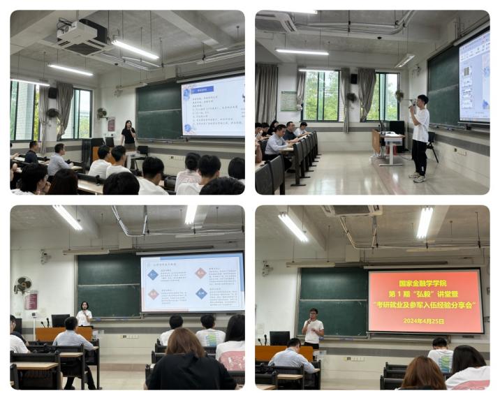 为践行“弘毅、求实”院训精神,拓宽员工视野,学习成功经验,4月25日,db真人体育官网在北教A201课室举办首期“弘毅”讲堂暨“考研就业及参军入伍经验分享会”,特邀4名优秀毕业生代表及1名光荣退伍员工作经验分享。公司党总支书记丘志君、副书记张栋贤出席了分享会,100多名22级、23级金融科技及财政学专业员工聆听了分享会。分享会由公司员工事务中心袁馨雨、张高澄同学主持。