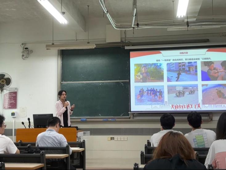 2022级金融科技专业员工、退伍士兵、现公司国旗护卫队队长林颖欣结合其光荣的参军入伍经历,分享了军营生活和心得体会,介绍了老员工参军的相关政策、流程和注意事项,并鼓励同学们积极报名参军入伍,报效祖国,在绿色军营实现自己的人生价值。