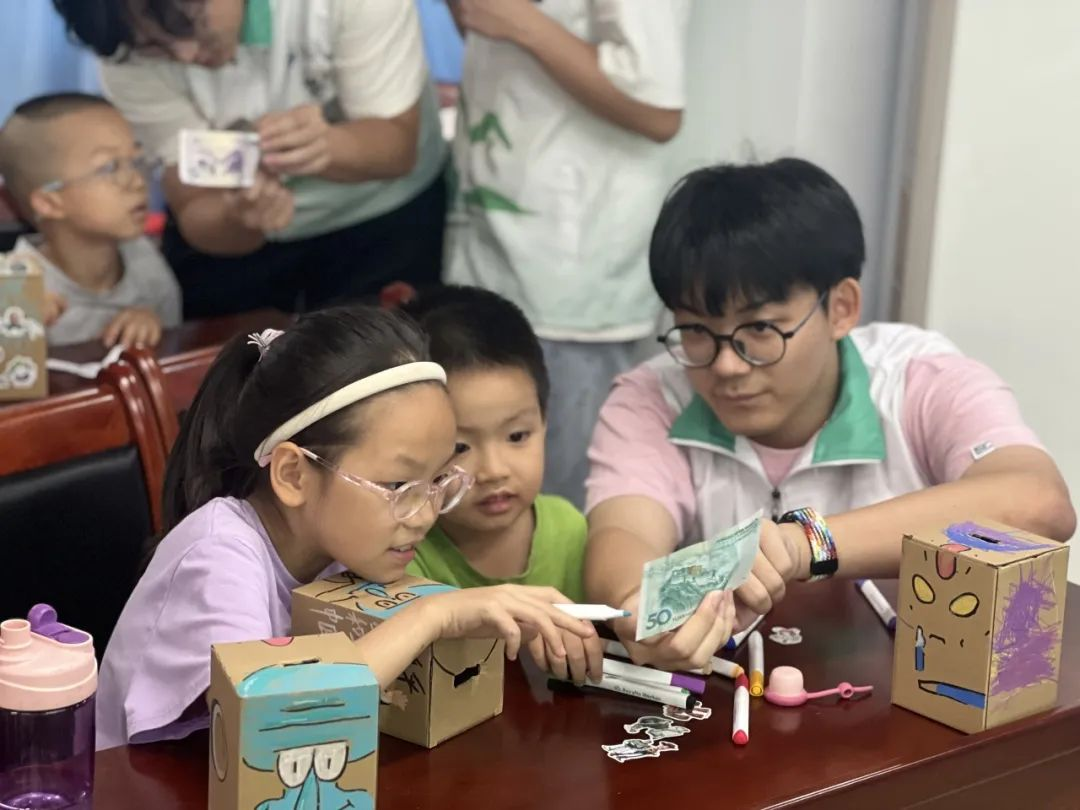 第一大系列课程为“财商小探险家之旅 ”。在该系列课程中,针对家长们在孩子金钱观培养上的焦虑,队伍精心设计了以《小兔子学存钱》绘本为基础的“故事魔法屋 ”、“创意储蓄工坊 ”、“真假币大侦探”等活动,让孩子们在沉浸式体验学习和趣味参与中,轻松建立对金钱的认知,用故事动画替代说教,让孩子理解货币与劳动的关联。活动尾声的“存钱罐 T 台秀 ”上,孩子们自信展示亲手制作的存钱罐;“小财商侦探证书 ”的颁发,更让他们收获满满的成就感,在欢乐与自豪中深化对财商知识的兴趣。