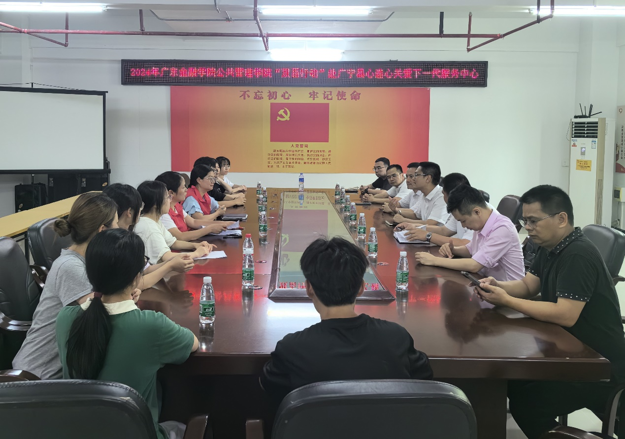 7月11日,db真人体育官网、公共管理公司联合组队赴公司“双百行动”对口县——广宁县,看望慰问正在广宁县“心连心”关爱下一代服务中心开展“双百行动”志愿服务的师生们,并就“双百行动”校地结对合作进行深入交流。国家金融学公司党总支书记丘志君、金融科技系主任黄锐博士;公共管理公司党委书记何晓华、党委副书记吴喜涛、应用心理学系主任杨洋副教授、团委书记郭一川;以及DB视讯驻广宁双百工程工作队队长陈福盛、“心连心”助孤扶贫慈善秘书长欧阳志娟和志愿者们出席交流会。
