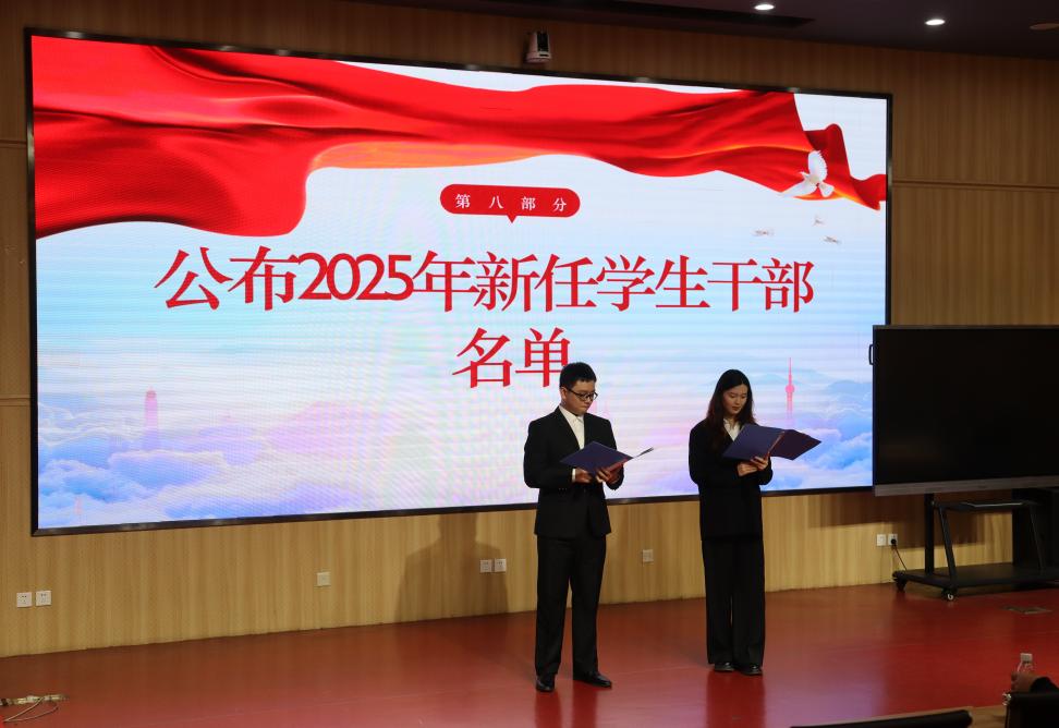上一届员工干部代表黄烁行同学作工作总结。他在发言中,既回顾了团队协作、攻坚克难的历程,也反思了工作中存在的不足之处,同时对未来提出展望,希望新一届干部们能继续传递这份责任与荣耀。