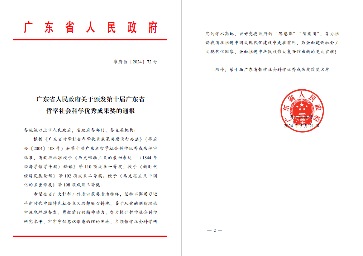 2024年5月21日,广东省人民政府正式公布《广东省人民政府关于颁发第十届广东省哲学社会科学优秀成果奖的通报》(粤府函[2024]72号文件)。来自通报名单显示,db真人体育官网2项科研成果获得奖励。