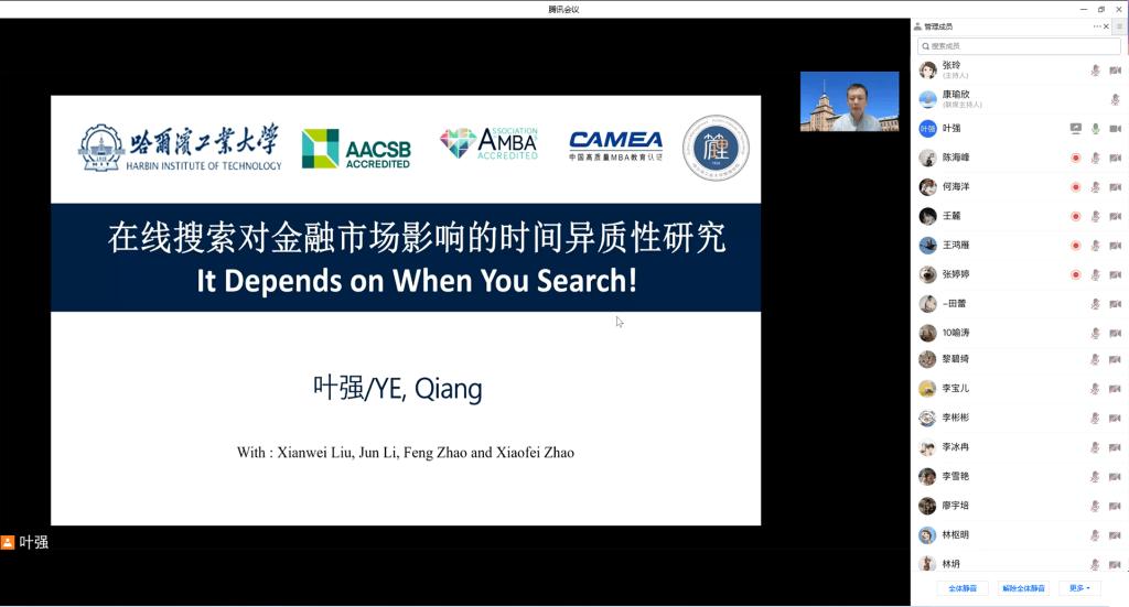 4月29日,哈尔滨工业大学经济与管理公司经理叶强教授做客公司“国家金融学大讲坛”,带来了题为“在线搜索对金融市场影响的时间异质性研究”的精彩报告。副董事长易行健、研究生处处长汪前元出席报告会,公司青年教师代表和全体研究生在线聆听。报告由经济贸易公司张玲教授主持。
