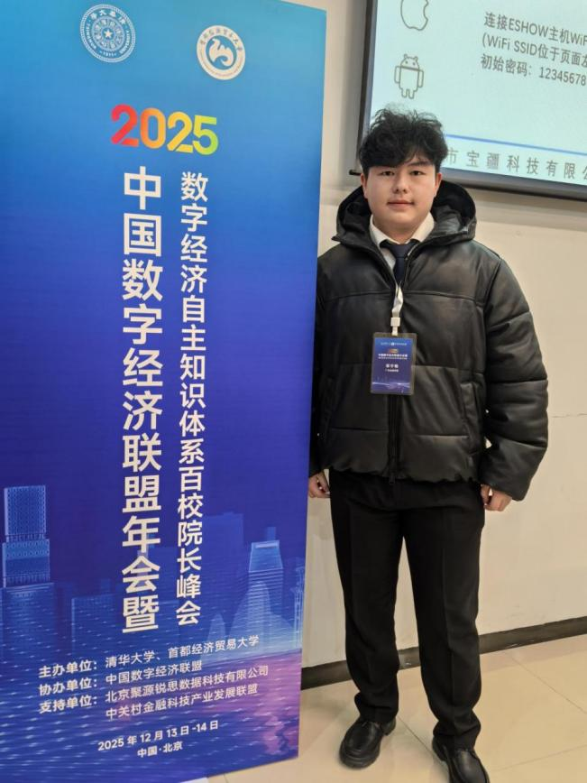 在国内高端学术交流方面,公司持续推动研究生参与国家级数字经济学术平台建设。韩迪老师团队中2024级研究生邹宇畅参加了中国数字经济联盟年会暨数字经济自主知识体系百校经理峰会。该会议由清华大学、首都经济贸易大学联合主办,是当前我国数字经济领域具有重要影响力的高端学术与政策交流平台。