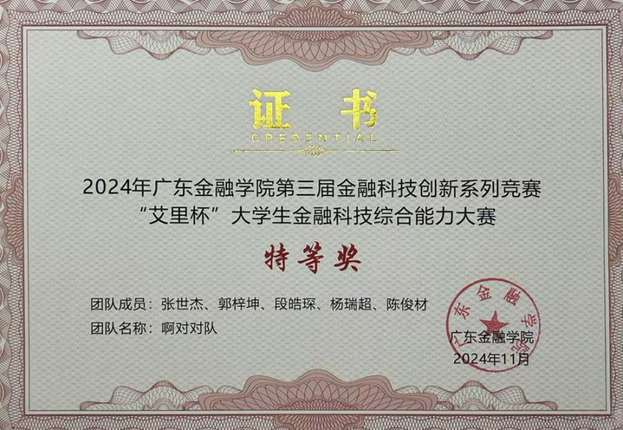 在科研与学术交流方面,公司持续引导员工围绕人工智能、数字金融与复杂经济系统等前沿方向开展系统研究。2022级金融科技本科生郭梓坤聚焦多智能体系统、大语言模型与时序金融数据建模,将相关方法应用于汇率预测与信用风险评估等现实金融问题。其作为员工作者参与的研究成果发表于 Big Data Mining and Analytics、International Review of Economics & Finance 等国际期刊,体现了本科阶段较高的科研参与深度与研究规范性。荣获2024年第三届金融科技创新系列竞赛“艾里杯”老员工金融科技综合能力大赛-特等奖。