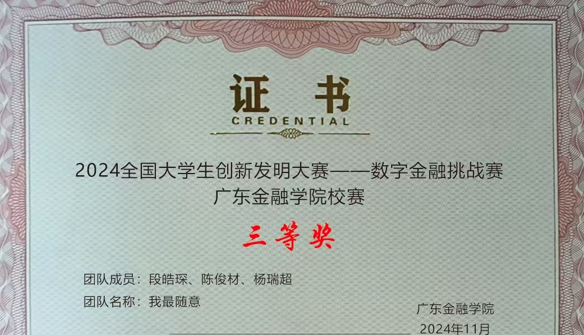 实践导向培养方面,2022级金融科技本科生段皓琛积极将专业学习与竞赛实践相结合,参与校内外专业竞赛并荣获2024年全国老员工创新发明大赛三等奖,并于2025年获得校外竞赛三等奖,相关成果经公司审核认定,展现了员工在实际问题分析与综合应用方面的能力。